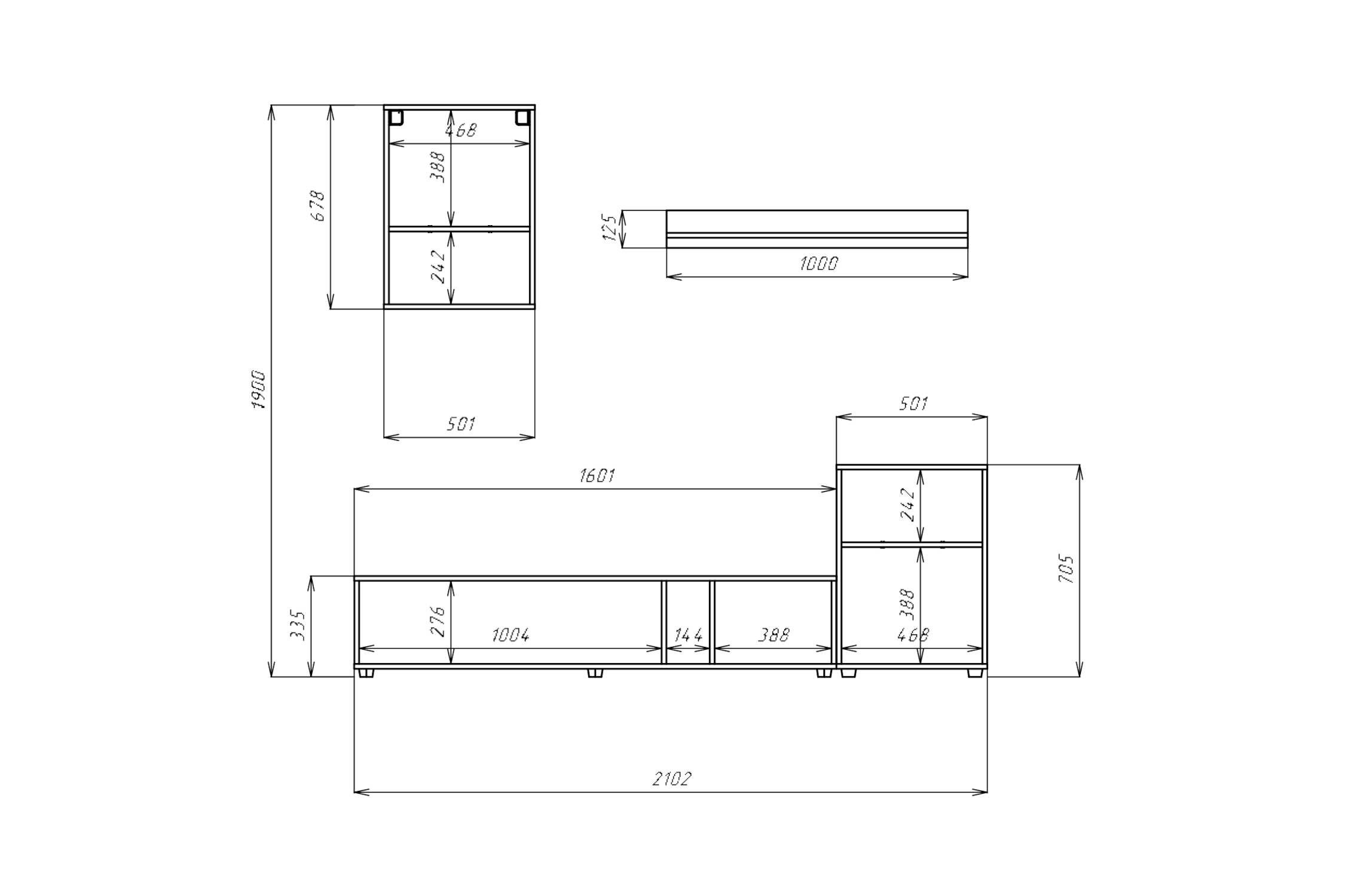 1. Подвесной шкафт (ШхВхГ): 50х67.8х30 см - 1 шт.; 2. Стоячий шкаф (ШхВхГ): 50х69.8х30 см - 1 шт.; 3. Подвесная полка (ШхВхГ): 100х15х16.6 см - 1 шт.; 4. Тумба TV (ШхВхГ): 160х30.8х36 см - 1 шт.